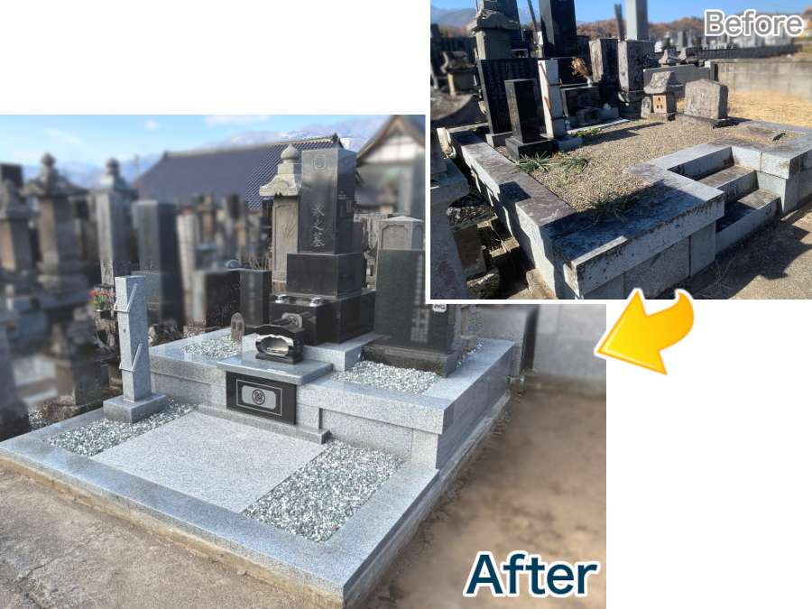 山梨県内でお墓づくりやリフォーム工事を承っております、村上石材店です。今回は、韮崎市の寺院墓地にてお墓のリフォーム工事をさせていただきましたのでご紹介いたします。