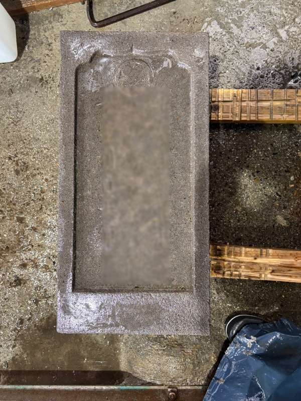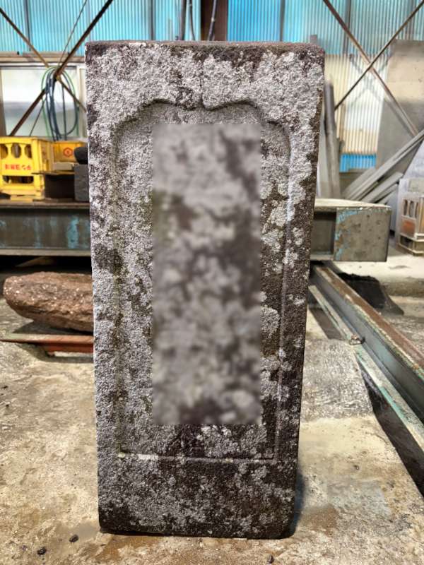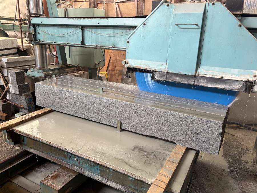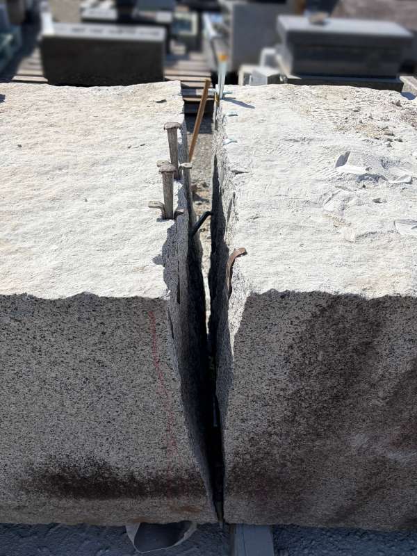 今回はできる限り石材を再利用する方向でのリフォームでしたが、外柵の一部など、どうしても不足する箇所は新たに作成します。ただ、既存の石と違和感が出ないよう、同じ塩山御影石を使用することにしました。手持ちの原石がありましたので、それを使って不足分の部材を加工していきます。