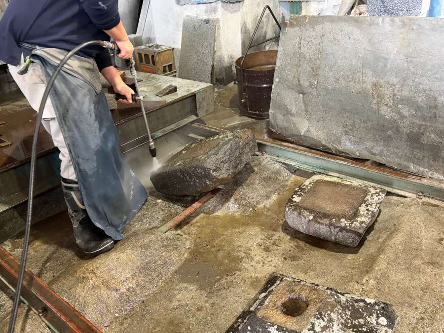 専用の薬品を使って、高圧洗浄も用いて丁寧に汚れを除去していきます。こちらは台座を洗浄しているところです。古い石材はヒビや劣化もあるため、状態を見極めながら、水圧にも注意して慎重に進めます。