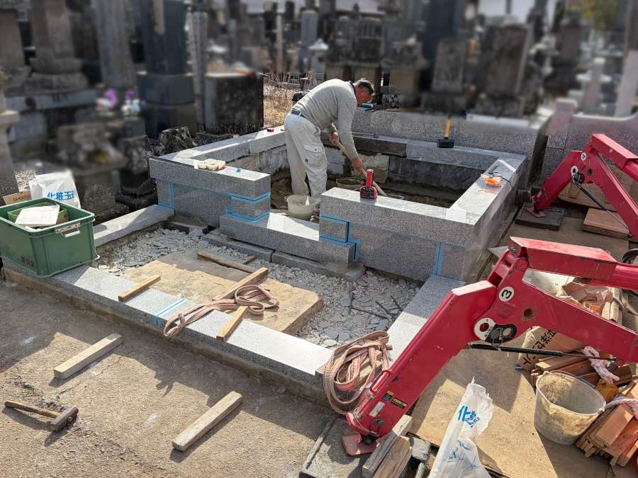 現地での工事では、まずはお墓をすべて一旦取り外してから基礎を打ち、外柵から据え付けを進めています。今回は「使えるものはできるだけ残したい」というお客様のお考えのもと、外柵もほとんどの石材が再利用されています。ただ、同じ塩山御影を使用しているので、どこが新しい石なのかほとんど分からないレベルです。
