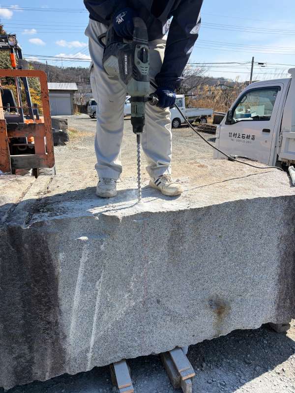 工場での作業の様子です。こちらは原石を小割りしているところです。機械でカットするために、まずは機械に入るサイズに割ります。石目を見ながらドリルで穴をあけ、セリ矢を打ち込んで割りました。